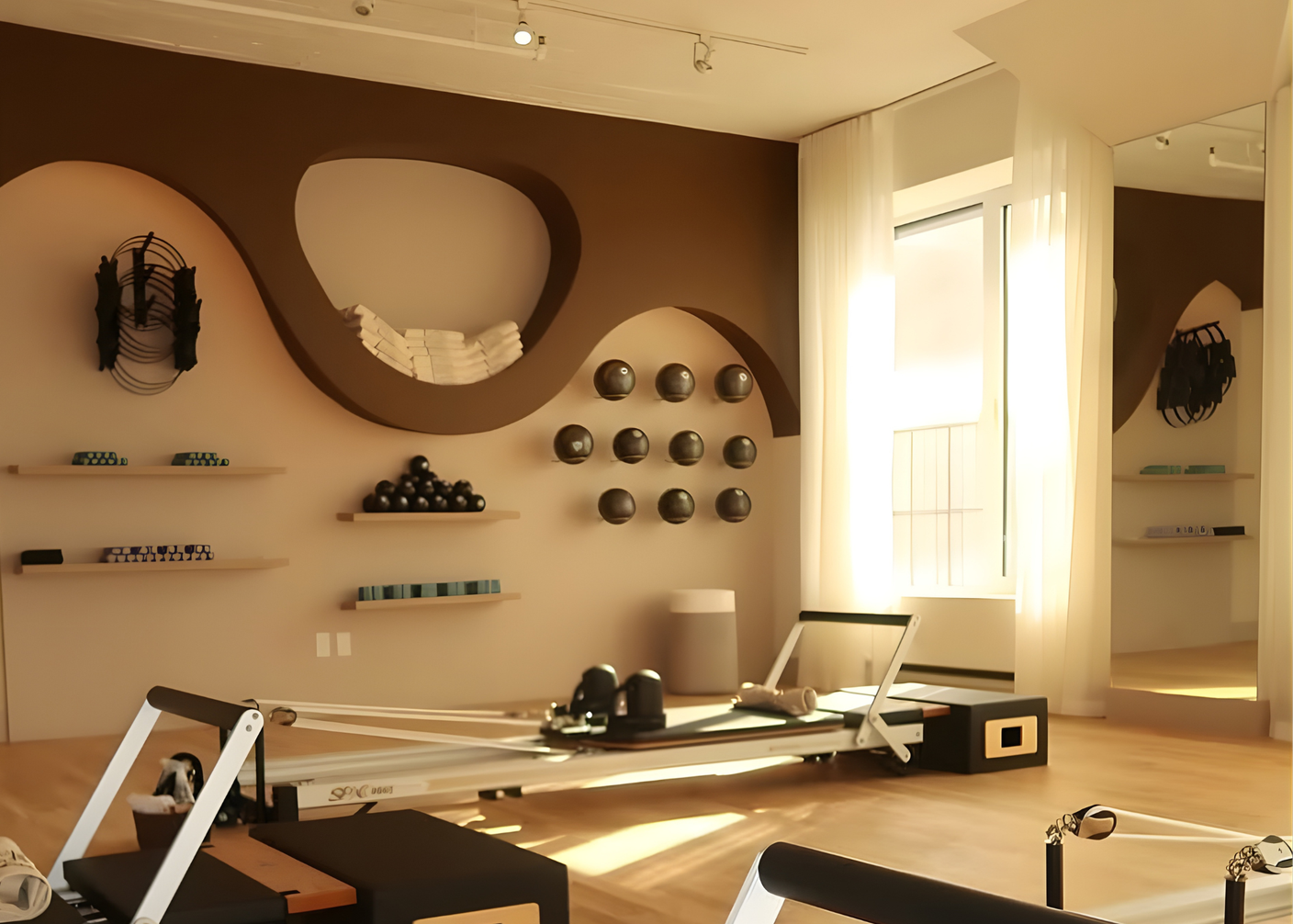 Panneau flexible concave en noyer brut pour un jeu d’ombre et de lumière unique et une adaptation parfaite aux murs courbes.